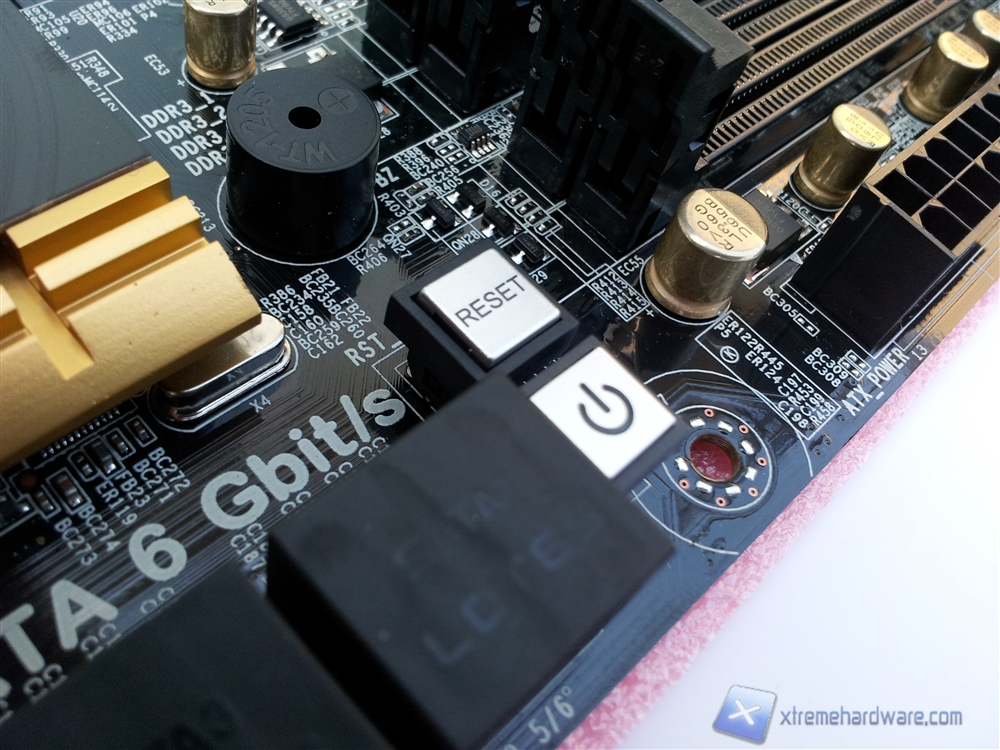 Nella parte destra, partendo dal basso, troviamo il connettore Mini-PCI con tanto di piedini per fermare le schedine, un piccolo display alfanumerico di diagnostica mentre poco più sopra, separati dai connettori SATA, sono presenti due pulsanti on-board di accesione e reset posizionati vicino al buzzer. La posizione di tali pulsanti è abbastanza buona anche se, montando una scheda video dalle generose dimensioni, raggiungerli sarà difficile e pericoloso in quanto si troveranno molto vicini al retro del PCB di quest'ultima. Per completare le features riguardanti l'overclock troviamo nella parte alta, poco sopra gli slot delle RAM, quattro punti di misurazione dei voltaggi: Vcore, Dimm, IMC, PPT, VAXG e ovviamente GND.