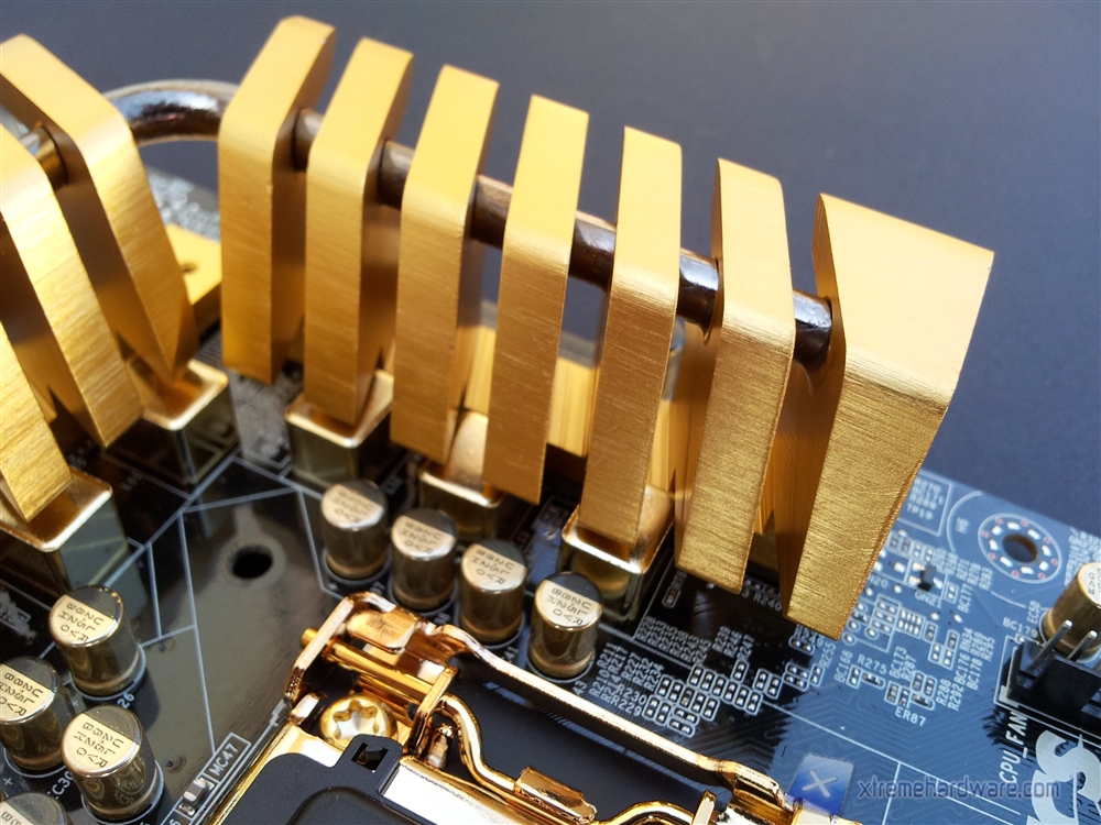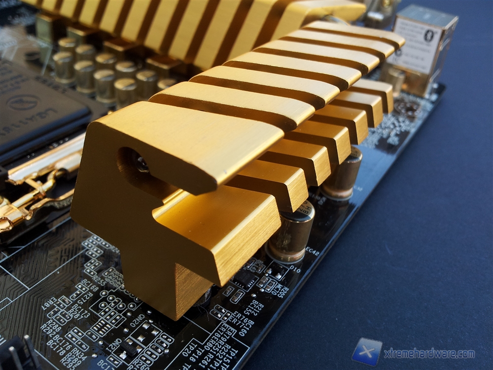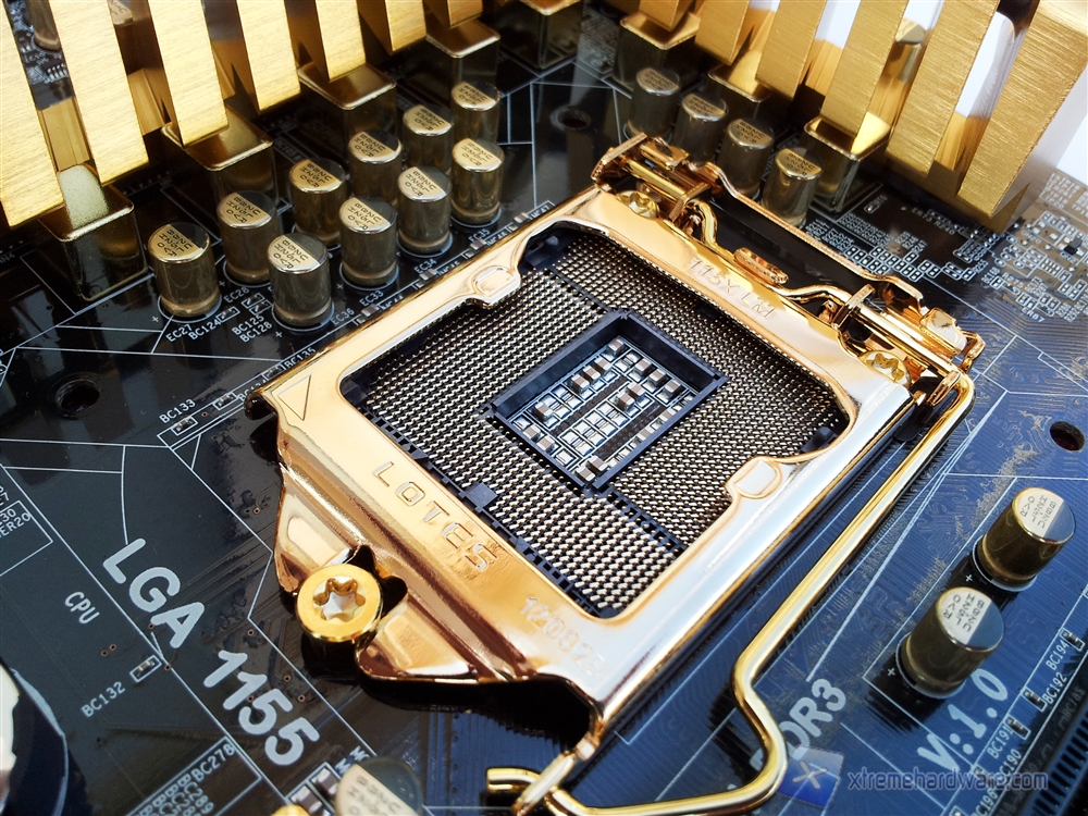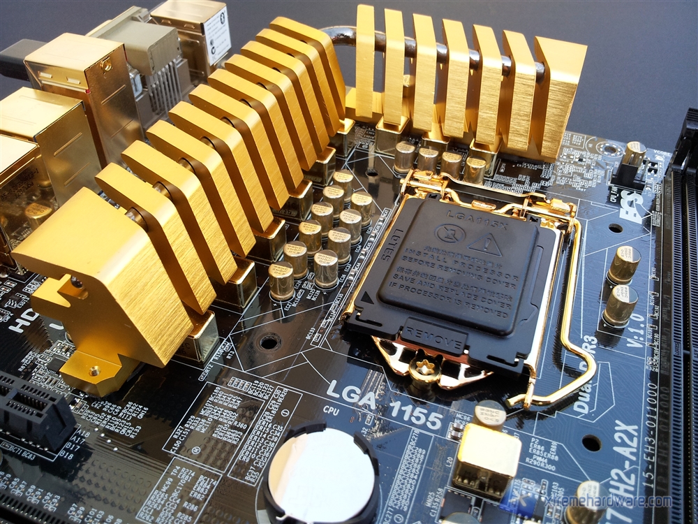 Le induttanze e i condensatori sono tutti di colorazione dorata così come il socket LGA 1155 che è dorato sia frontalmente che nel backplate. La scheda madre in questione è disposta di alimentazione a 9 fasi in ferrite, inoltre sia i pin della CPU che quelli delle RAM sono caratterizzati da un utilizzo leggermente superiore di oro che dovrebbe garantirne una maggior affidabilità nel tempo.