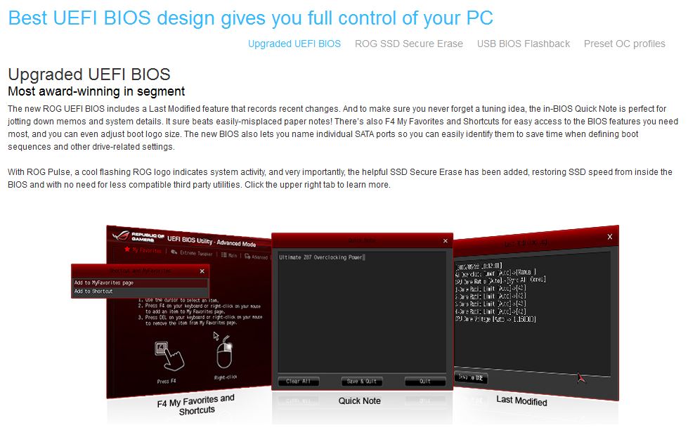 L’interfaccia BIOS UEFI realizzata per la famiglia di prodotti ASUS ROG è tra le più premiate del settore e permette tra l’altro, nella fase di salvataggio ed uscita dal BIOS, di prendere visione ed annotare in modo sintetico le modifiche apportate.