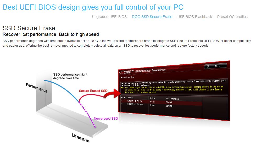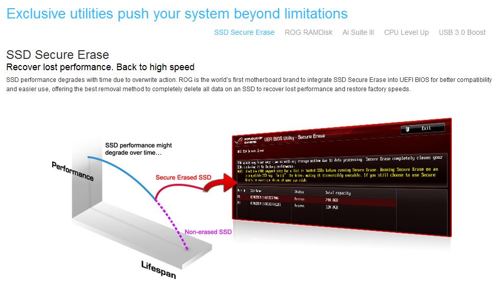 Le schede madri di classe ROG sono le prime al mondo ad integrare nel BIOS lo strumento software SSD Secure Erase per cancellare in modo sicuro il proprio SSD e ripristinare di fatto le prestazioni originali di fabbrica.
