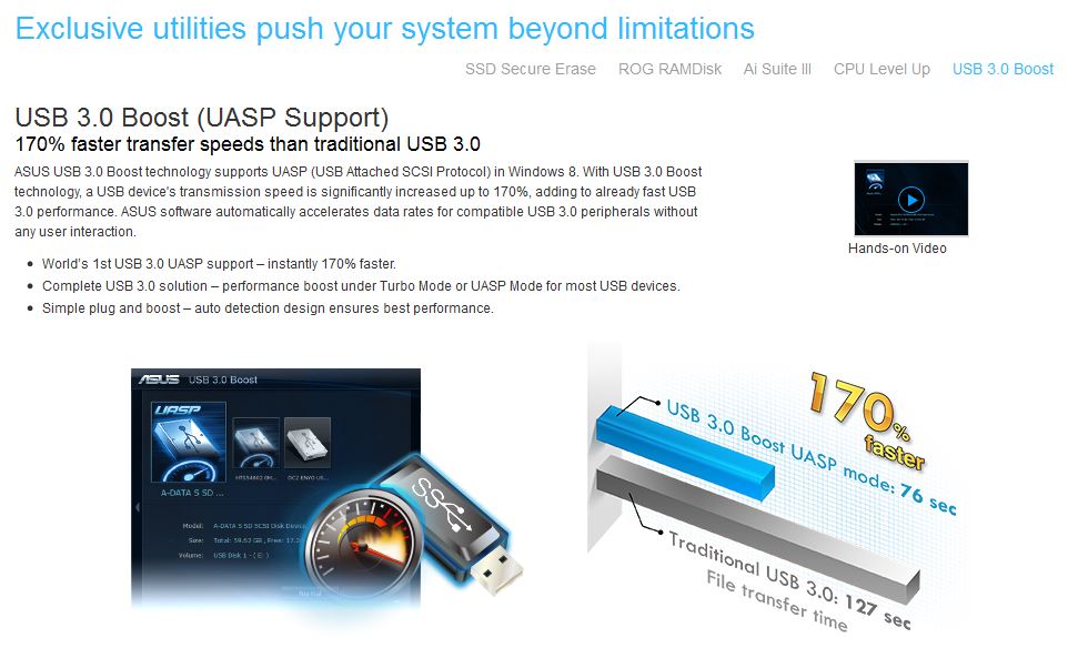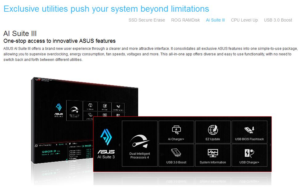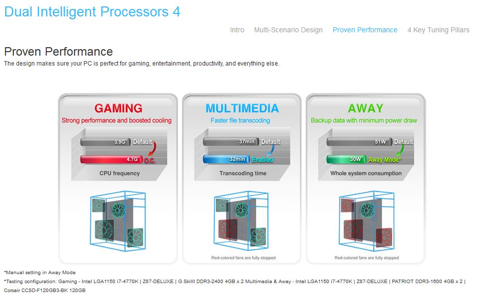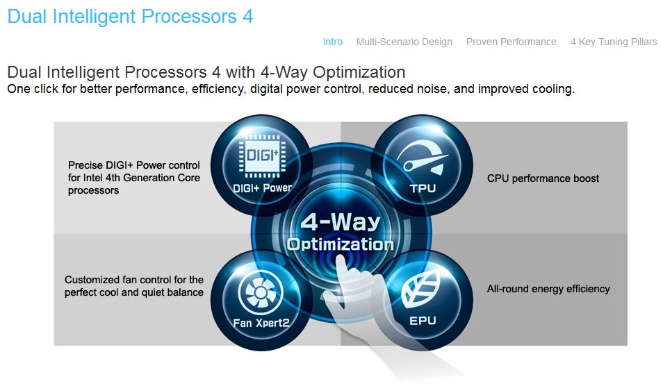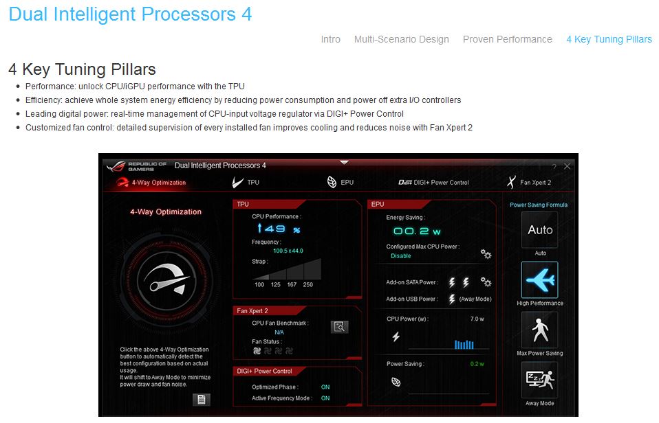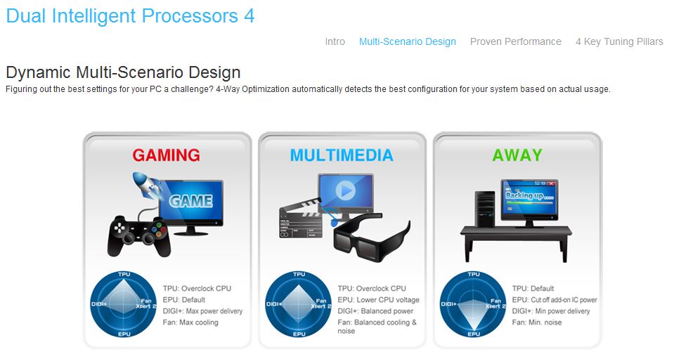 Per i meno esperti nelle fasi di overclock o semplicemente per migliorare rapidamente in un click le prestazioni globali, ASUS ha realizzato il Dual Intelligent Processor 4 che automaticamente ottimizza i parametri di funzionamento legati al consumo e rumore del sistema in relazione alla potenza richiesta, permettendo all’utente di scegliere tra 3 scenari diversi di utilizzo.