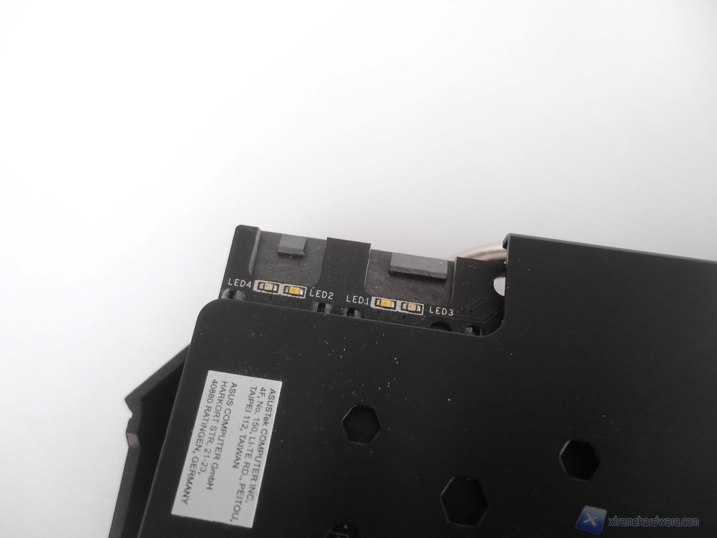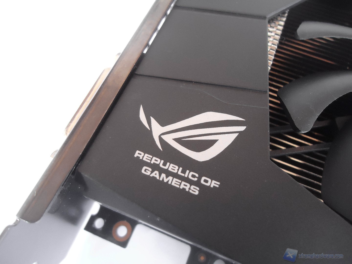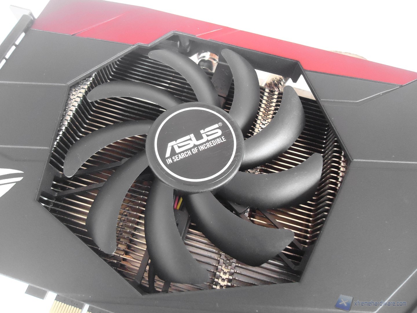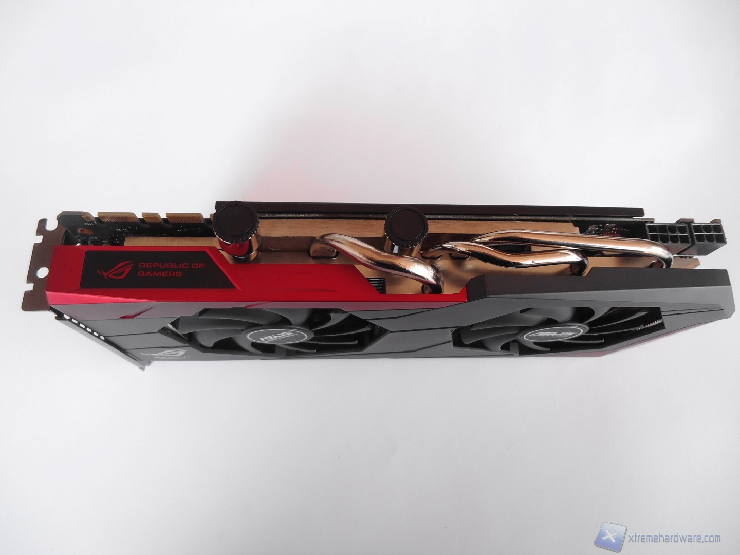 La cover purtroppo è realizzata in plastica, materiale ormai abbandonato dalla schede video di fascia più alta, e presenta una colorazione in tipico stile ROG. La cover in questo caso ha il compito di sorreggere le ventole oltre che di dare rigidità strutturale alla scheda. Le 2 ventole, che hanno il compito di raffreddare il radiatore sottostante, sono di discrete dimensioni e infatti misurano circa 90mm di diametro ciascuna. Quest’ultime sono dotate di una speciale tecnologia ASUS che gli permette di accumulare meno polvere rispetto a delle normali ventole, grazie al loro particolare design dust-proof.. Purtroppo queste due ventole non sono dotate della tecnologia semi-fanless che troviamo ormai su quasi tutte le sue concorrenti dirette, anche se le ventole in idle sono molto silenziose. Il radiatore in alluminio presenta 3 heatpipes in rame nichelate che non sono a diretto contatto con la GPU, contrariamente a quanto succede con la tecnologia DirectCU II. Le heatpipes presentano un diametro di 6mm per le due più esterne mentre abbiamo un diametro da 8mm per la restante. Per quanto riguarda la dissipazione della sezione VRM, che è composta da 10 fasi gestite dal controller DIGI+, è previsto che una parte del dissipatore in alluminio vada a coprire questa porzione consentendo una migliore dissipazione rispetto all’uso di un dissipatore passivo in alluminio stand-alone.