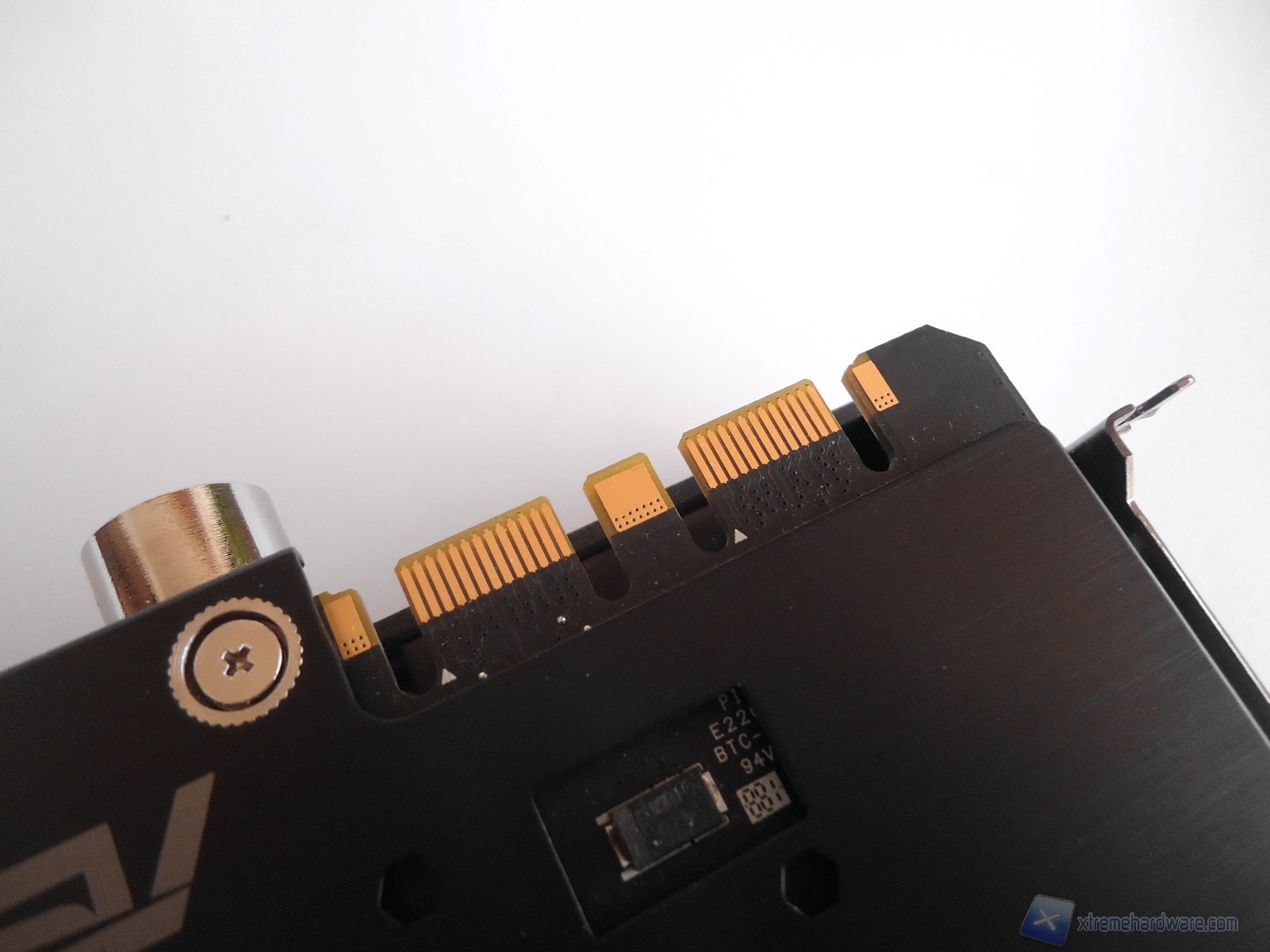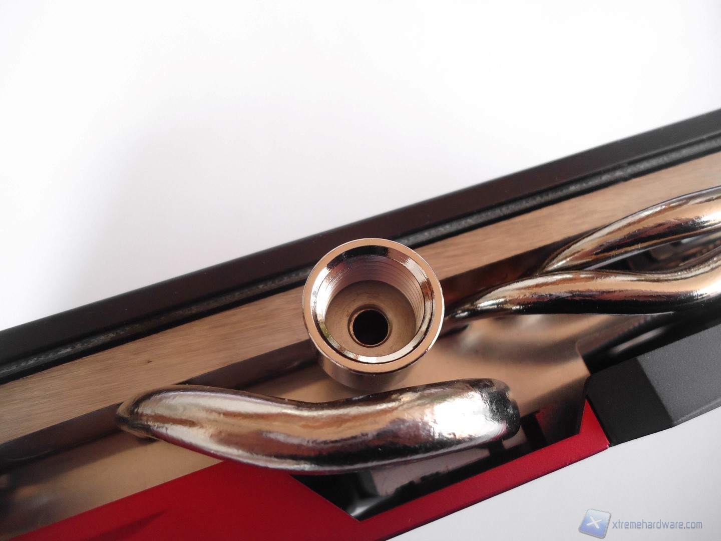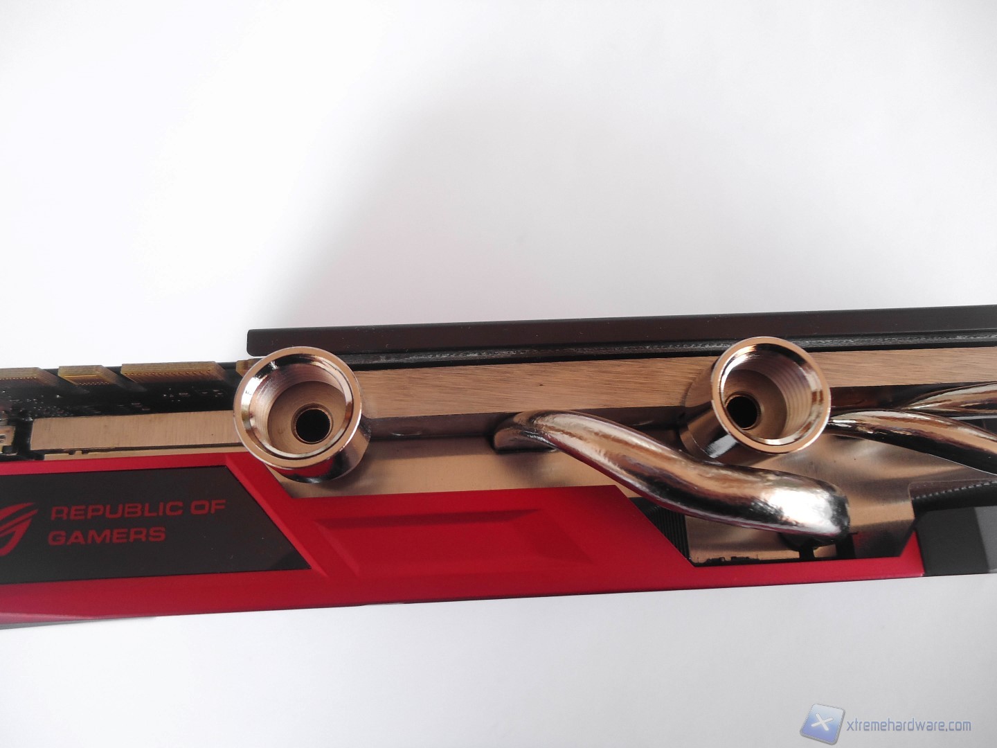 La parte superiore della scheda presenta prima di tutto il bellissimo LED ROG che lampeggerà di rosso quando la scheda sarà in funzione. Dietro di esso possiamo notare i due connettori per lo SLI, che ci permetteranno di mettere fino a 4 schede video in parallelo. Centralmente troviamo la vapor-chamber con i due connettori per i raccordi G 1/4” completamente nichelati e le 3 heatpipes in rame nichelate, che hanno il compito di trasportare il calore dalla camera di vapore fino al radiatore in alluminio. Nella parte finale della scheda notiamo i due connettori di alimentazione da 1x8-pin e 1x6-pin che ci permetteranno di spingere la scheda in overclock senza problemi.