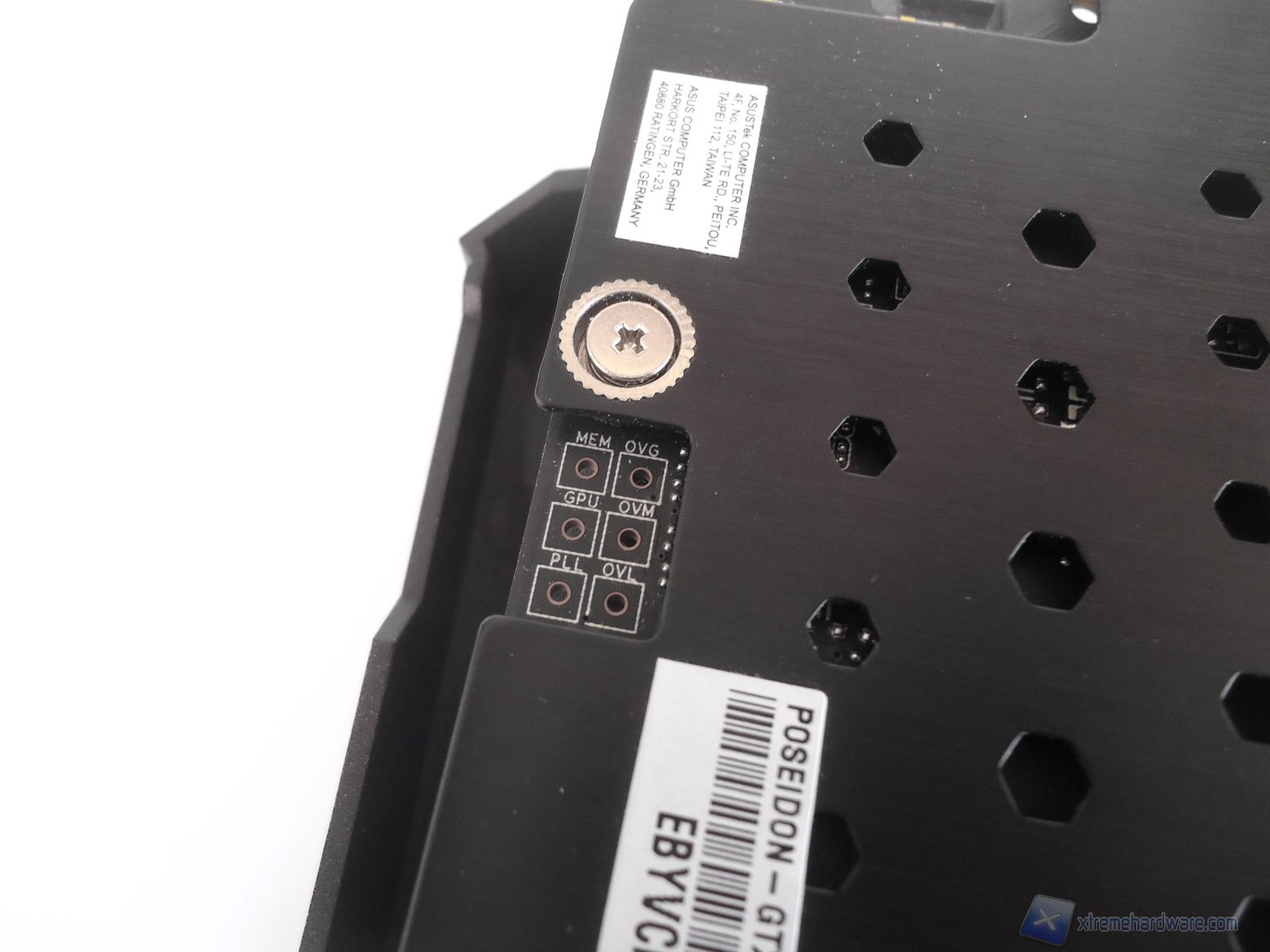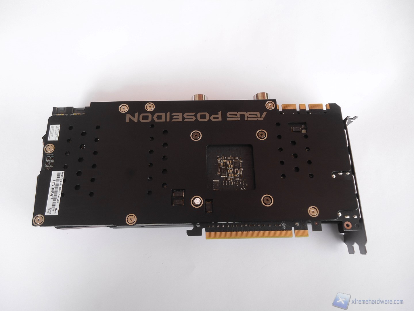 Girando la scheda osserviamo con piacere che è fornita di uno splendido backplate in alluminio spazzolato di colore nero abbellito dalle scritte ASUS e Poseidon di colore bianco. C’è da dire che questo backplate ha una sola funzione, in quanto serve solamente a dare maggiore rigidità alla scheda ma non a raffreddare alcun componente in quanto non sono presenti sul lato posteriore del PCB. Da notare la presenza di un bollino di garanzia sulle viti posteriori del dissipatore, in questo modo non possiamo cambiare pasta termica, cambiare dissipatore o installare un waterblock senza perdere la garanzia. Possiamo notare inoltre sulla parte posteriore alcuni punti di misurazione del voltaggio, molto utili in sessioni di overclock spinto, e due LED sotto i connettori di alimentazione che si illumineranno di bianco quando la scheda sarà correttamente alimentata. Da segnalare infine che questa scheda presenta un PCB fuori standard in altezza, quindi dovremmo prestare molta attenzione prima di comprare questa scheda, verificando che entri senza problemi nel nostro case. D’altra parte si presuppone che se acquistare questa scheda video avrete già un impianto a liquido installato nel vostro case a cui collegare la Poseidon, quindi con abbondante spazio a disposizione.