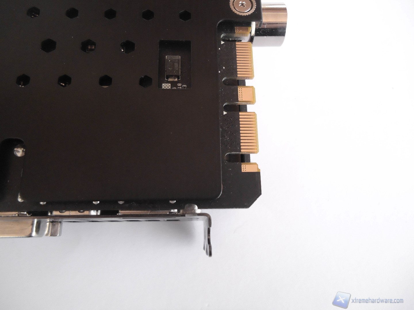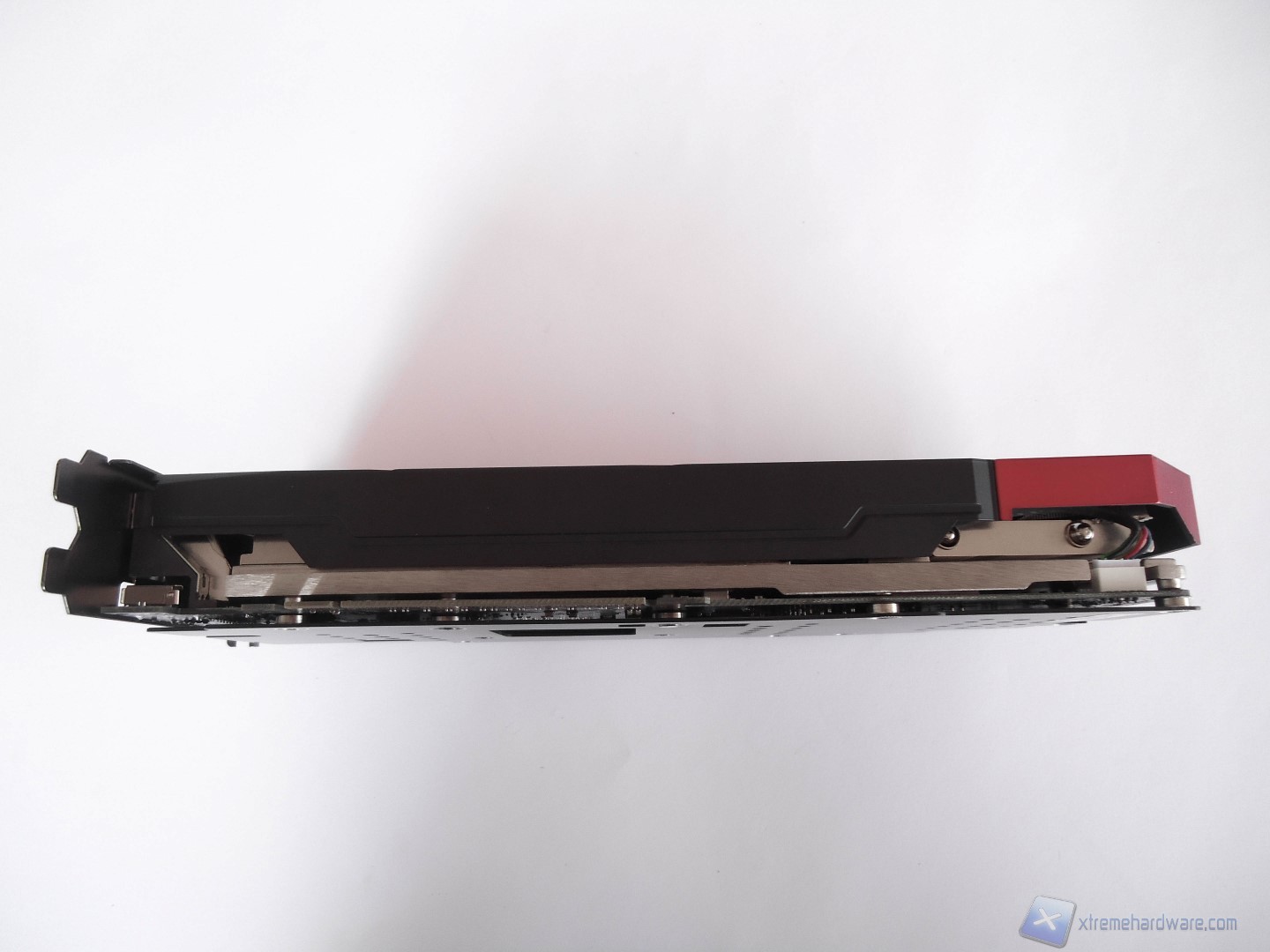 La parte inferiore della scheda ci mette in mostra la struttura portante della cover in plastica, la presenza del connettore PCI-E 3.0 e l’estensione in lunghezza della vapor-chamber.