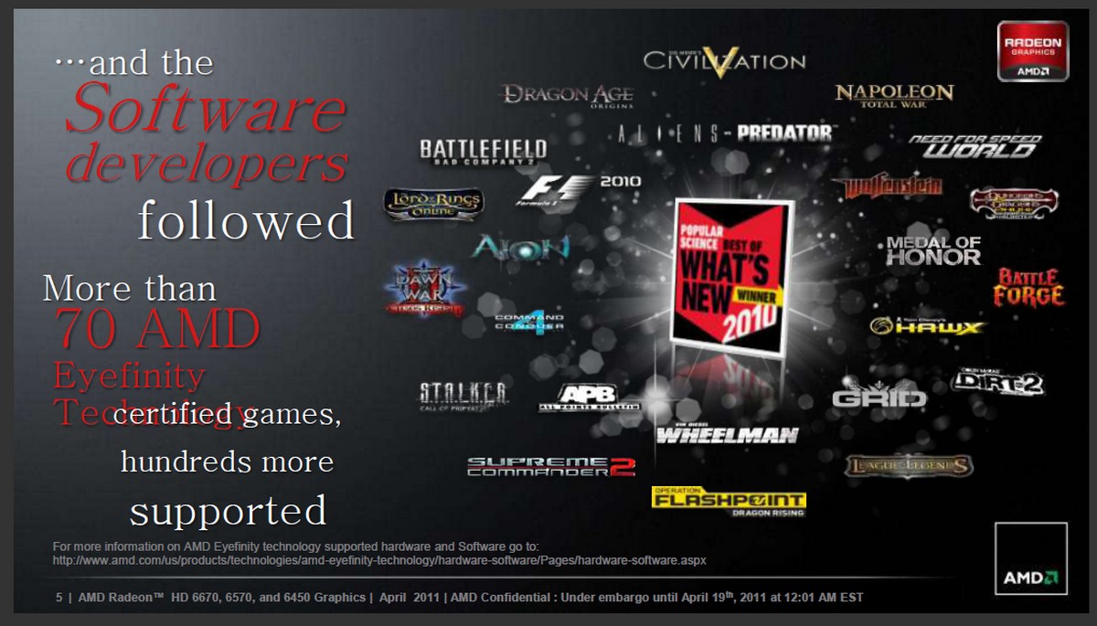 Con Caicos e Turks, AMD ha portato su queste schede caratteristiche molto interessanti. Troviamo infatti il supporto alla tecnologia Eyefinity Multimonitor fino a 3 schermi, che per una scheda di fascia bassa, come nel caso di Caicos, è una feature molto interessante, in quanto solitamente è un'opzione delegata a schede di fascia ben superiore. La presenza di questa nuova funzionalità multimonitor è un passo decisivo nel fornire anche all'utenza media una feature che può essere utile non soltanto per gli appassionati di videogiochi, ma anche, e soprattutto, per chi vuole incrementare la propria produttività nell'utilizzo delle applicazioni e del pc in generale, sia in ambienti home sia in ambienti office, dove poter estendere il proprio desktop con la funzionalità multimonitor è un fattore fondamentale. La tecnologia Eyefinity di AMD è supportata ormai da più di 70 giochi per pc, che usano in maniera corretta tutte le possibili combinazioni.