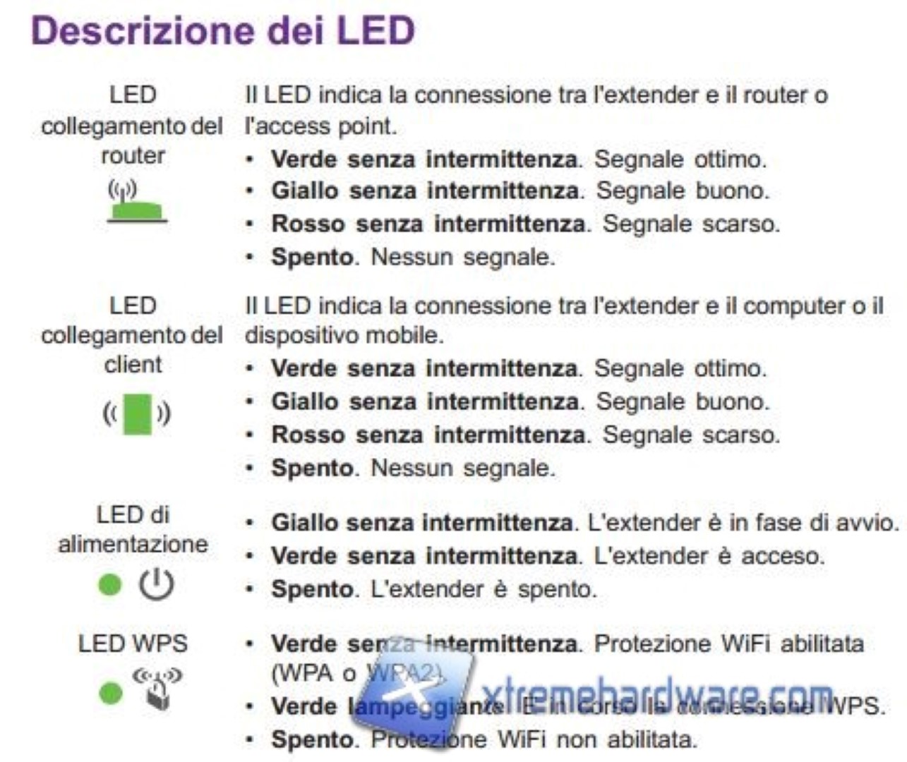 Vi riportiamo comunque due piccoli grafici/schemi che chiariranno meglio la tipologia e funzionamento dei LED di stato presenti nella parte frontale dell’extender.