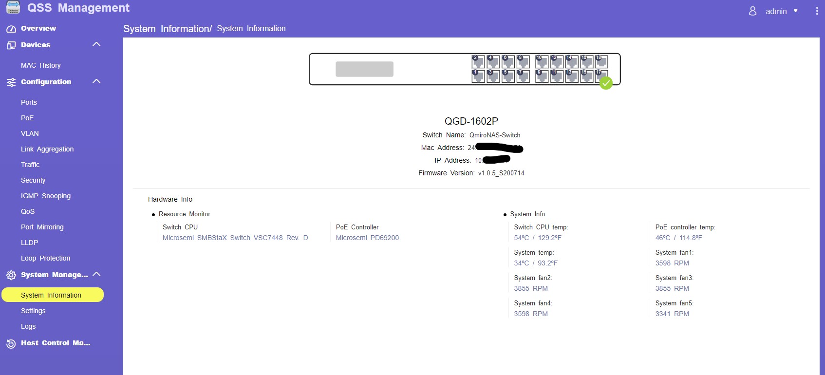 Passando alla parte di configurazione dello switch i parametri che potremo andare a settare sono tutti quelli che ci aspetteremo da un Switch di Livello II. Quindi oltre all’analisi dello stato delle porte, alla configurazione del PoE porta per porta, creazione di VLAN, Link Aggregation, fino all’analisi e settaggio del QoS (Quality of Services – che ci permetterà di migliorare il traffico nella rete andando a classificare e assegnando priorità ad un tipo di pacchetto / device rispetto ad un altro) arrivando fino alla Loop Protection (che proprio come ci dice il nome rileva ed evita la formazione di loop sulle porte Ethernet)