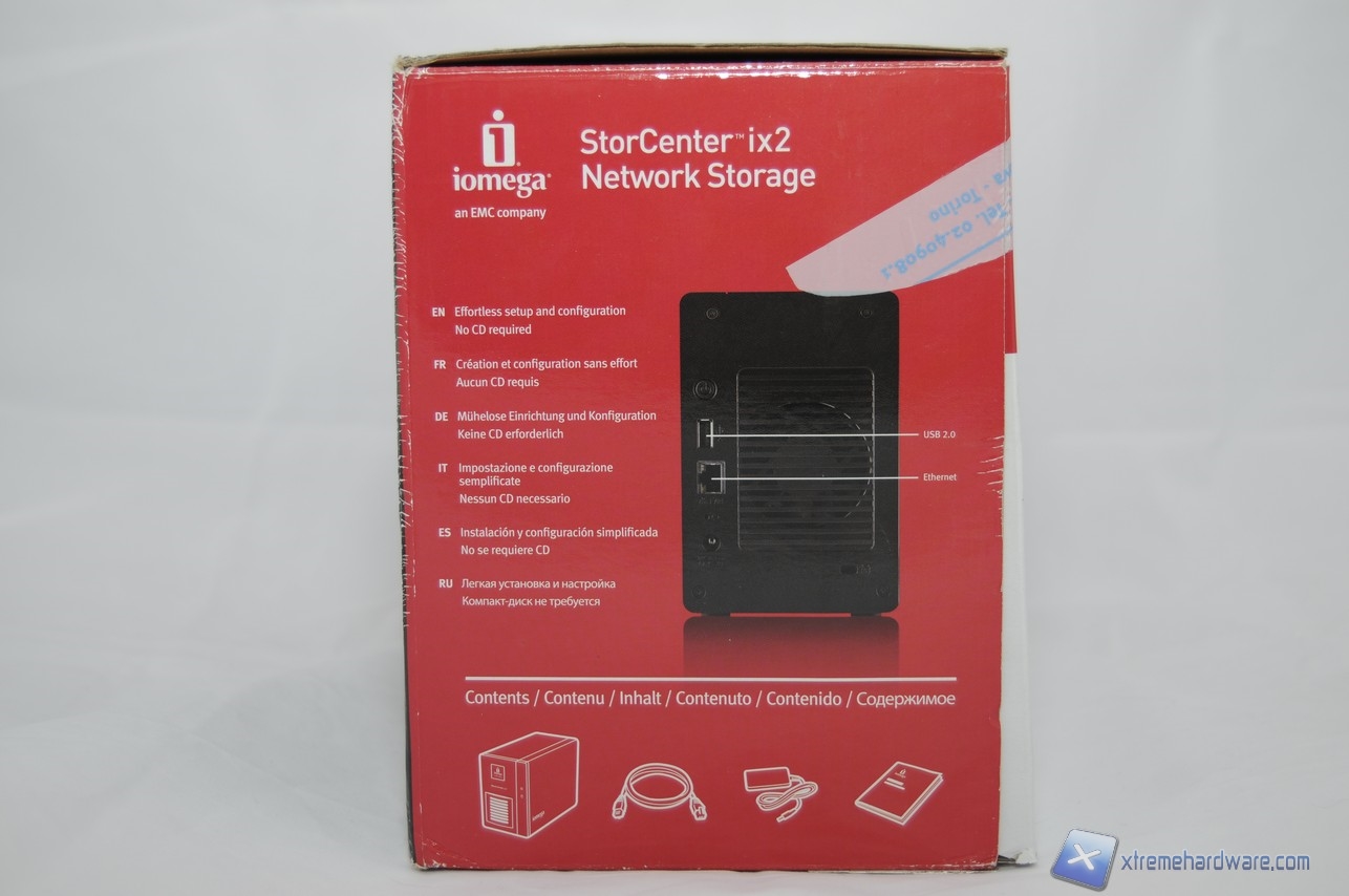 I lati destro e sinistro riportano informazioni riguardanti il prodotto; a sinistra troviamo infatti un'immagine dello StorCenter e un avviso multilingua che ci avverte della facilità di configurazione, mentre a destra troviamo in inglese e francese tutte le specifiche tecniche.