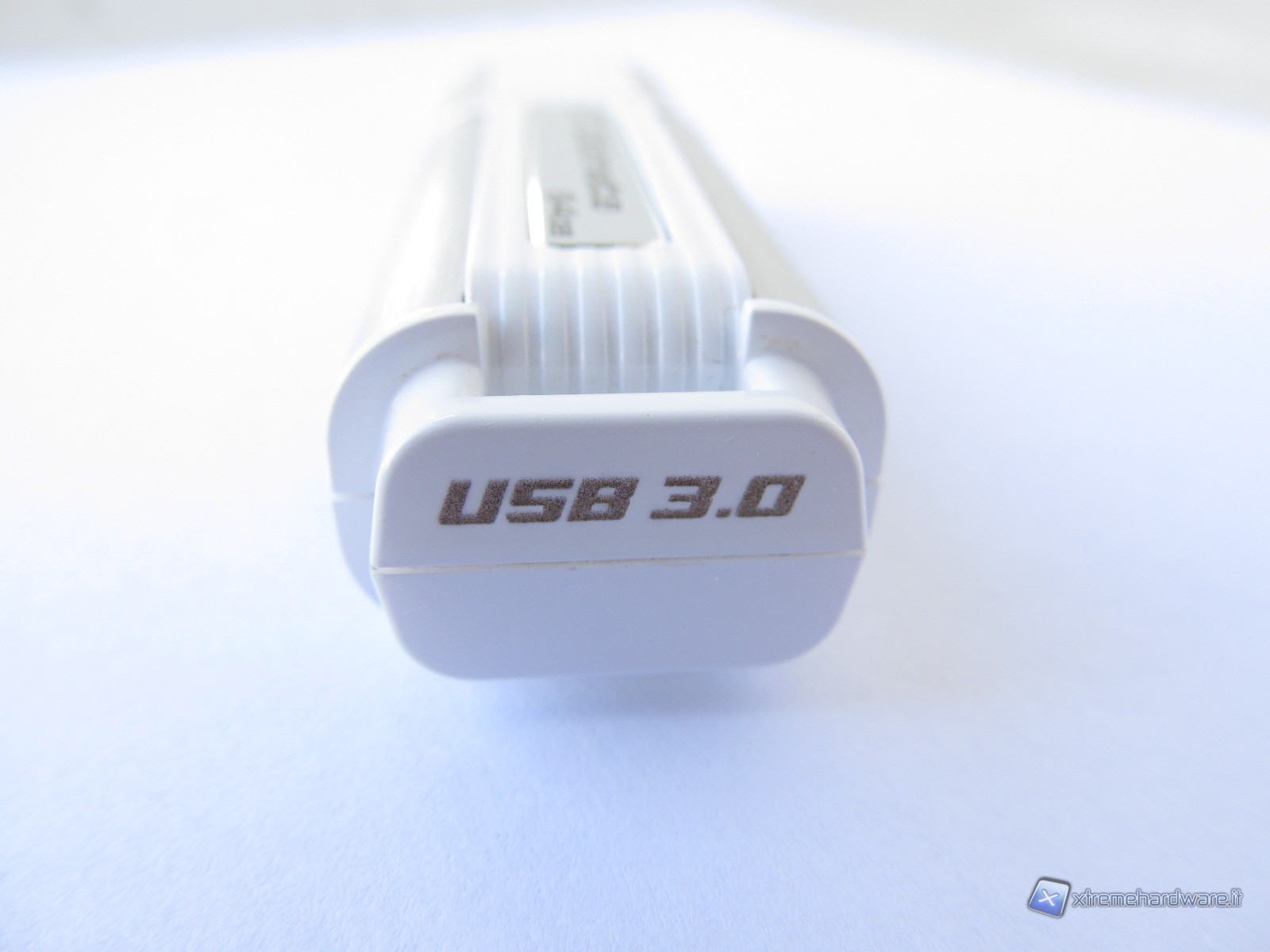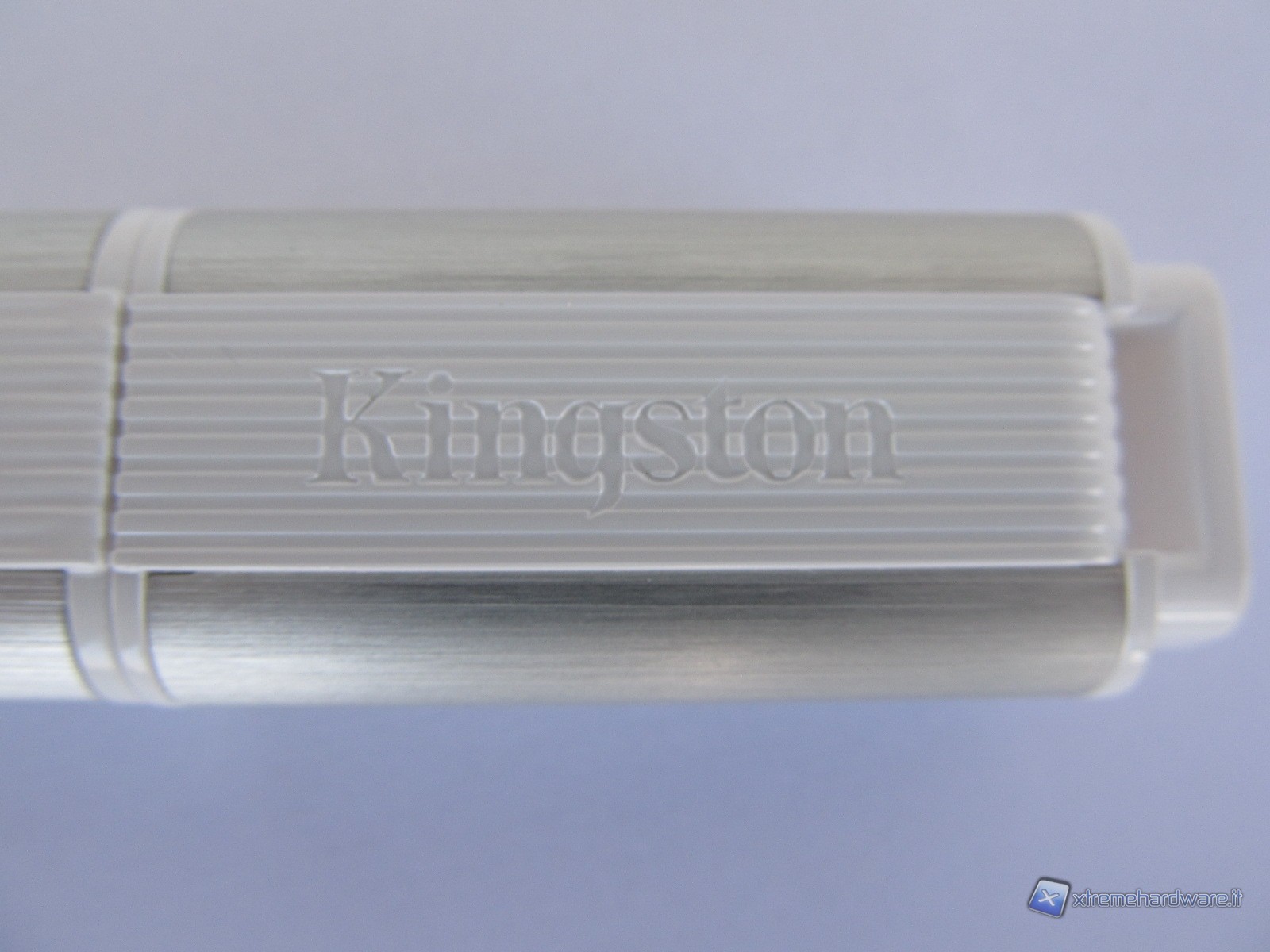 Passando sul lato opposto possiamo vedere il logo della casa produttrice intagliato nella struttura di protezione, mentre nel lato posteriore possiamo leggere una scritta che ci ricorda che si tratta di un Flash Drive USB 3.0. Eventualmente è possibile inserire la penna in un portachiavi grazie al foro presente. Non visibile all’esterno, la Data Traveler Ultimate nasconde un led di colore blu che si accende quando il Drive viene inserito in una porta USB, lo stesso diviene lampeggiante quando si trasferiscono dati da e/o per il Drive stesso.