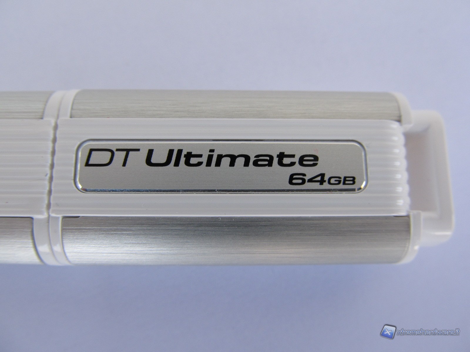 Sul lato principale possiamo vedere il logo DT Ultimate riportante anche il taglio della penna (in questo caso 64GB); oltre a questo notiamo il cappuccio protettivo composto sempre dagli stessi materiali plastificati e di alluminio, il quale all’occorrenza può essere tranquillamente inserito nella parte posteriore della pennetta al fine di azzerare i rischi di smarrimento dello stesso.