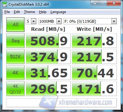CrystalDiskMark è un utilissimo software per misurare le performance in lettura e in scrittura in modo sequenziale (sequential) e casuale (random), grazie al pieno supporto del NCQ (Native Command Queuing) l'ordine degli IOPS viene ottimizzato in modo da migliorare le prestazioni di input/output con una Queue Depth (file in coda) di 32, tale test consente di osservare il comportamento del drive durante il trasferimento di numerosi file con dimensioni ridotte.