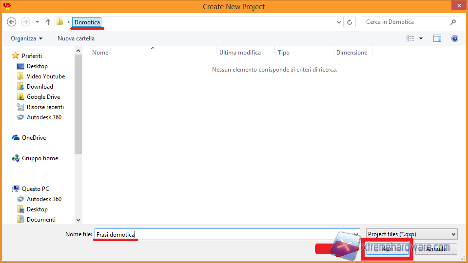 Dopodiché ci comparirà una finestra per selezionare la destinazione del progetto. Ovviamente la potete salvare dove meglio preferite, ma io vi consiglio di creare una sottocartella per contenere tutti i file che verranno creati in automatico quando andremo a comprimere/trasformare le nostre frasi. Infine, clicchiamo su Apri.